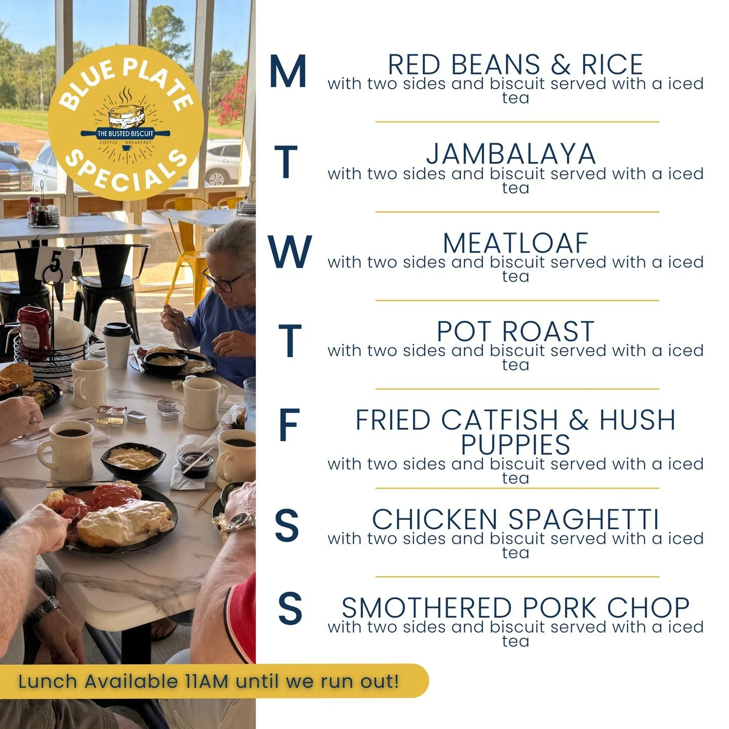 At The Busted Biscuit, we believe that great food brings people together. That’s why we take pride in every dish we serve, starting with our signature biscuits—made from scratch and baked fresh daily. Whether you’re stopping by for a hearty breakfast, a satisfying blue plate lunch, or a comforting dinner, you’ll find that our menu is crafted to nourish both body and soul.